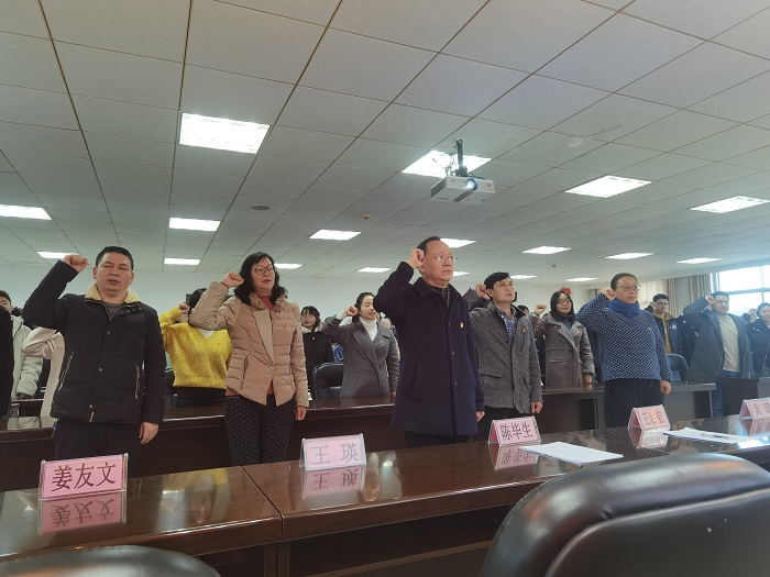 陈毕生、王治航、黄暐、王瑛、以及各党支部书记为新党员佩戴党徽。由陈毕生带领全体新党员宣誓,大家列队整齐,共举右手,在党旗下庄严承诺。