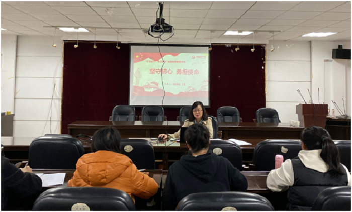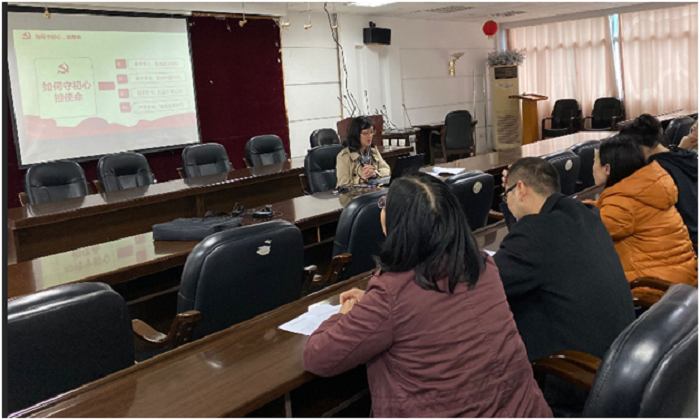 王瑛的党课题目是“坚守初心,勇担使命”,第一部分与大家交流“什么是中国共产党人的初心和使命?”作为高校,我们的责任是什么,初心是什么,使命又是什么?第二部分指导各位同志守初心,担使命要做到以下四点:善于学习,提高政治站位;勤于思考,坚持问题导向;勇于担当,扎实开展工作;严于修身,锤炼过硬作风。