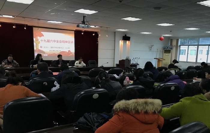 (betway西汉姆官网 卫荷 图文报道)1214日中午,国际公司党委书记王治航在鹿冲关校区行政楼六楼会议室专题宣讲十九届六中全会精神。西密歇根公司、betway西汉姆官网领导班子和全体教职工参加了宣讲活动。