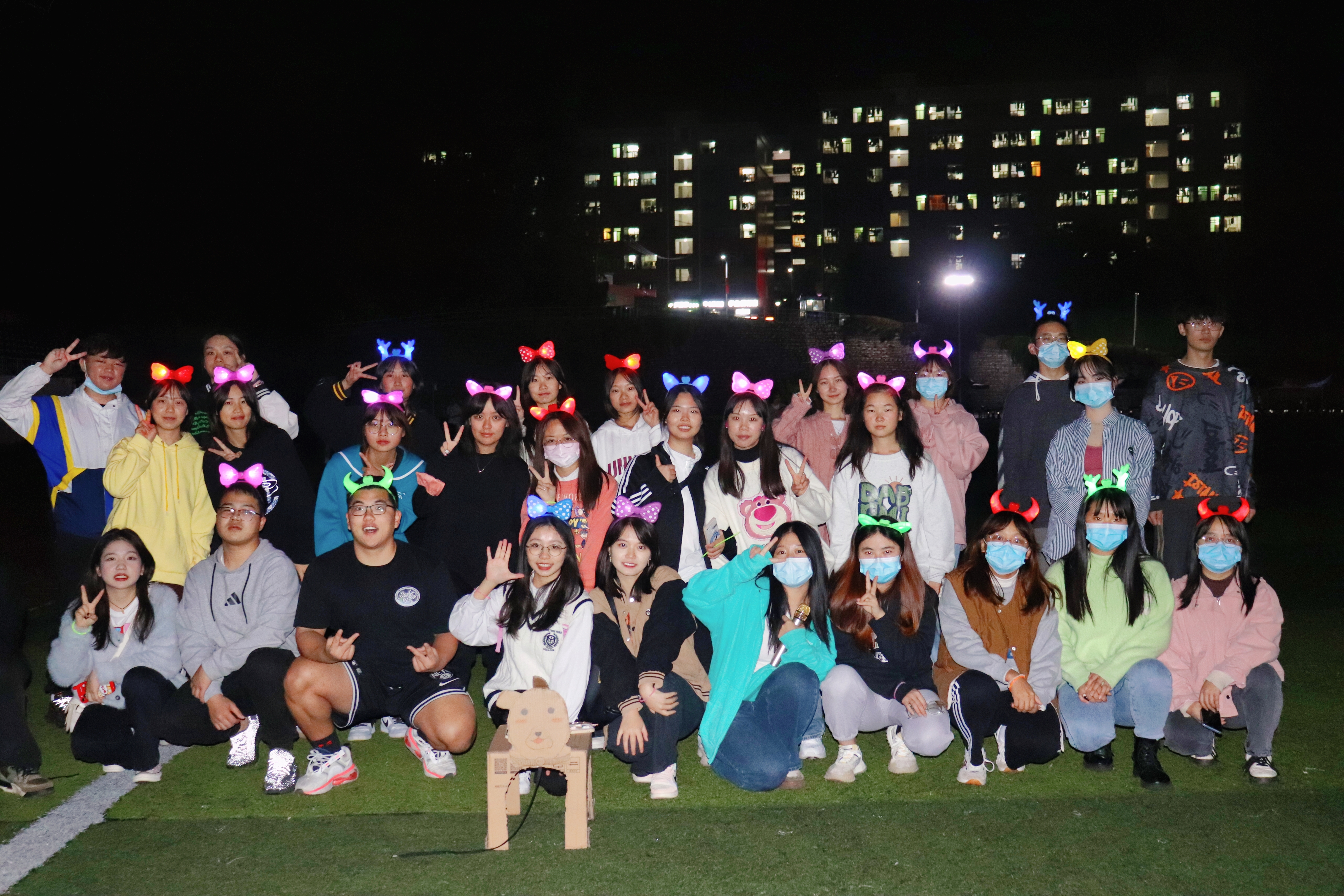 晚上,参赛同学们到足球场有序签到,领取荧光夜跑物资。为确保“荧光夜跑”活动能够安全有序的开展,在正式开始前,工作人员向同学们强调了相关注意事项。随后,同学们纷纷用荧光棒,荧光饰品等物品来武装自己。所有同学站在起跑线上,随着指令的发出,同学们一起出发,他们头戴荧光饰品,手握荧光棒,将整个校园装点成了一个荧光闪耀的欢乐海洋,涌动的人群在跑道上形成了一道道靓丽的风景线,为校园增添了一抹跃动的青春亮色。
