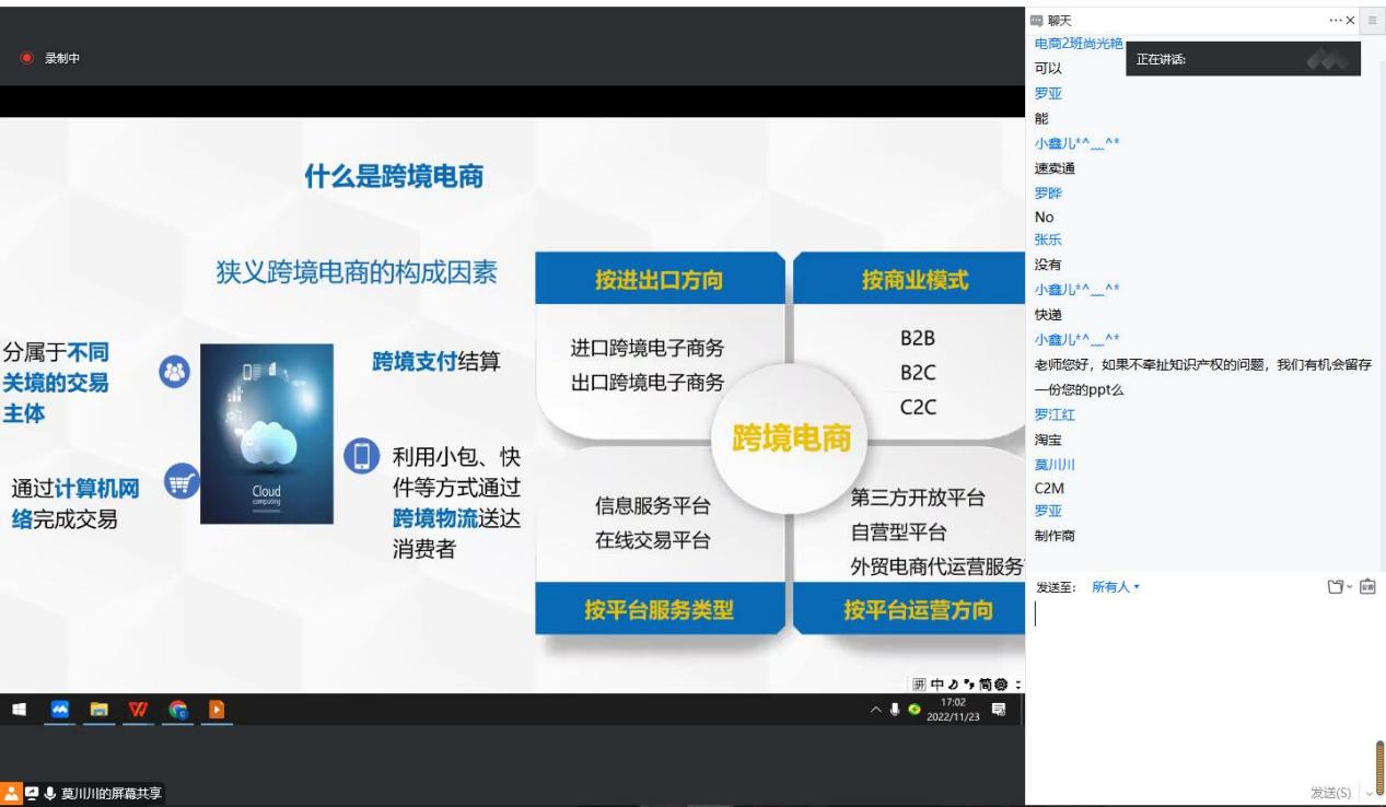 莫川川通过校企合作模式分析介绍了电子商务专业的发展现状,着重在专业人才培养模式方面进行了讲解。同时,以广州番禺职业技术公司与阿里巴巴校内实践实况作为案例分享,引入了跨境电商发展现状的分析,分析中以跨境电商的参与主体、跨境电商服务商生态和跨境电商发展历程等几方面做出了详细讲解。其次,莫川川通过跨境电商三部曲:曝光、点击和成交(ECO)展开跨境电商主流平台运营特点的分析。分析过程中主要以电商思维之“黄金三要素”和5大营运节点进行讲解,并且以亚马逊为例让参与讲座的人员实际参与到相关问题的思考中。最后,莫川川以跨境电商运营前景分析和TikTok Shop简介结束了此次讲座。讲座过程中,莫川川、罗亚和参与此次讲座的师生进行了良好的互动,大家纷纷就自己对电子商务的疑问进行沟通交流,讲座气氛融洽,学术氛围浓厚。