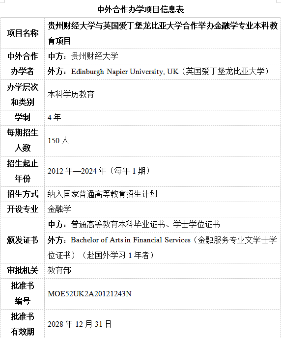 GUFE-ENU BA (Hons) Financial Services 项目介绍 2012年,根据《教育部关于公布中外合作办学项目审批结果的通知》(教外综函﹝2012﹞30号),betway西汉姆官网与英国爱丁堡大学合作举办金融学专业本科教育项目获得教育部批准,是贵州省第一个本科层次的中外合作办学项目。2015年,根据《关于通报2015年本科及以上层次中外合作办学评估结果的通知》(教外司办学﹝2015﹞2028号),betway西汉姆官网与英国爱丁堡大学合作举办金融学专业本科教育项目评估合格。2021年,根据《关于通报2020年本科以上中外合作办学机构和项目评估结果及后续工作要求的通知》(教外司办学〔2021〕212号),betway西汉姆官网与英国爱丁堡大学合作举办金融学专业本科教育项目评估合格。 betway西汉姆官网从爱丁堡龙比亚大学引进三分之一的外方课程。双方共同制定教学计划和培养方案,共同授课,共享双方的优质教育资源。