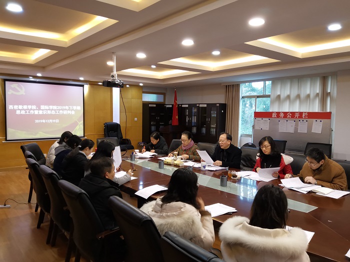 会上由班子成员领学了《中国共产党宣传工作条例》、《中共betway西汉姆官网委员会贯彻落实意识形态工作责任制实施办法(试行)》、《中共betway西汉姆官网委员会落实<党委(党组)网络意识形态工作责任制>实施方案》等相关文件,党委副书记黄暐、王瑛分别汇报意识形态工作和思想政治工作,各科室负责人、各支部书记结合工作实际,汇报了近半年自身工作中的风险点及整改措施。与会人员就如何进一步加强外教的意识形态管理、外方教材及教学的监控、员工的教育引导示范及制度建设等进行交流。