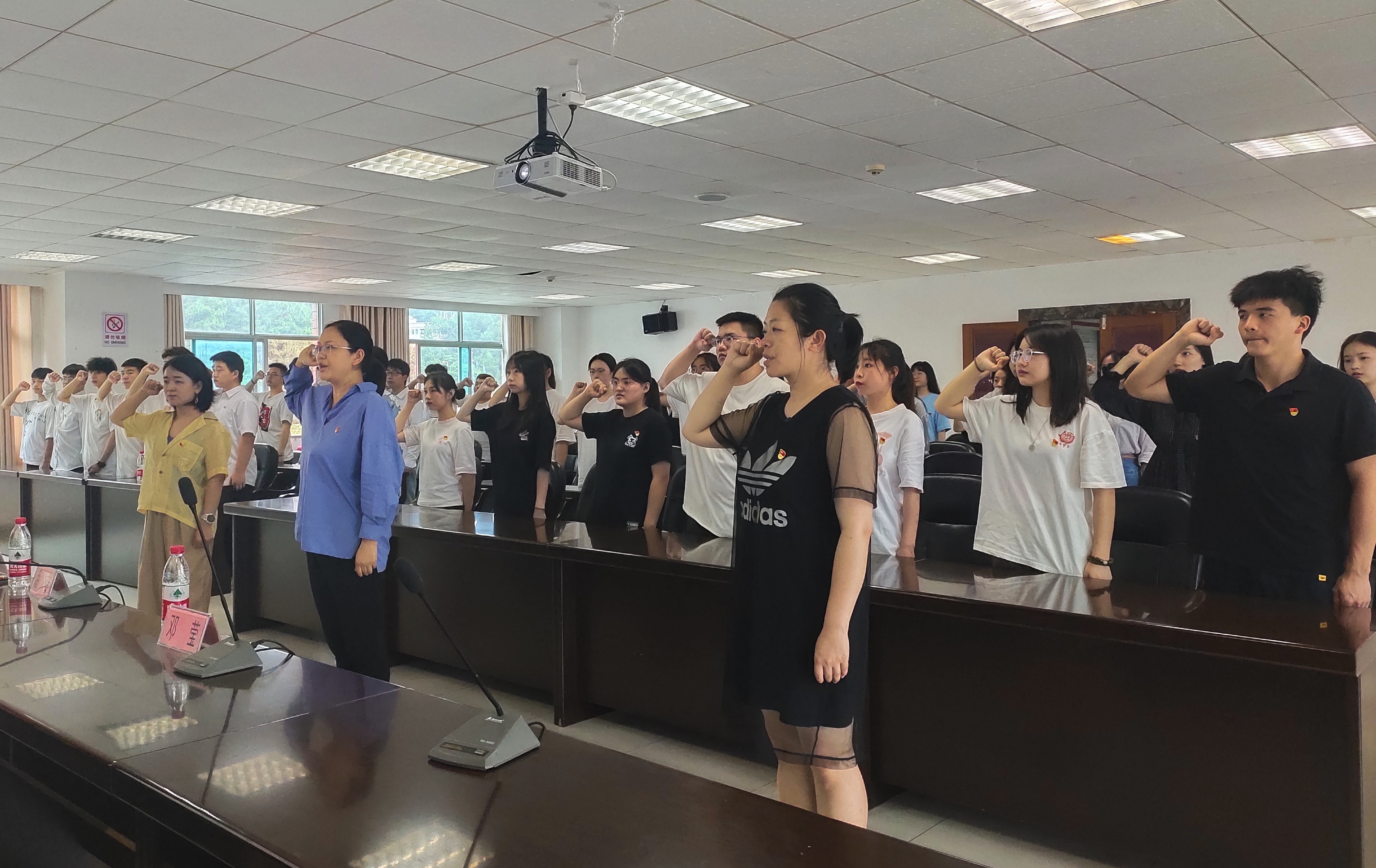 仪式开始,全体起立奏唱国歌。紧接着,由潘吉领誓,全体党员右手握拳,坚定地面向鲜红的党旗庄严宣誓,语气铿锵有力。