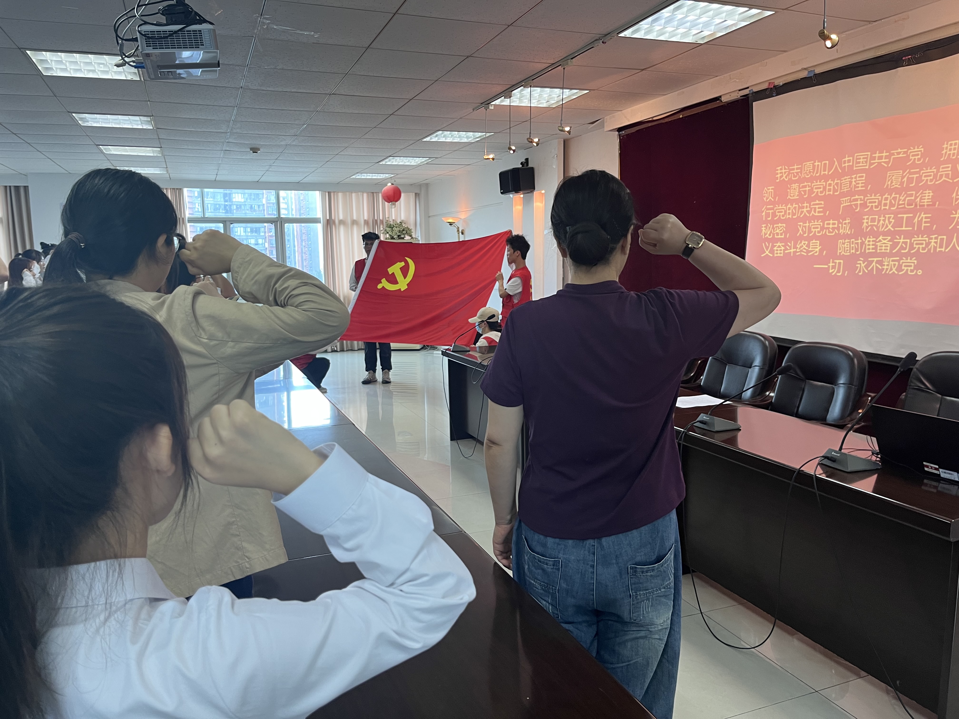 随后,在黄暐的带领下,新党员面对鲜艳的党旗,进行了庄严的入党宣誓。