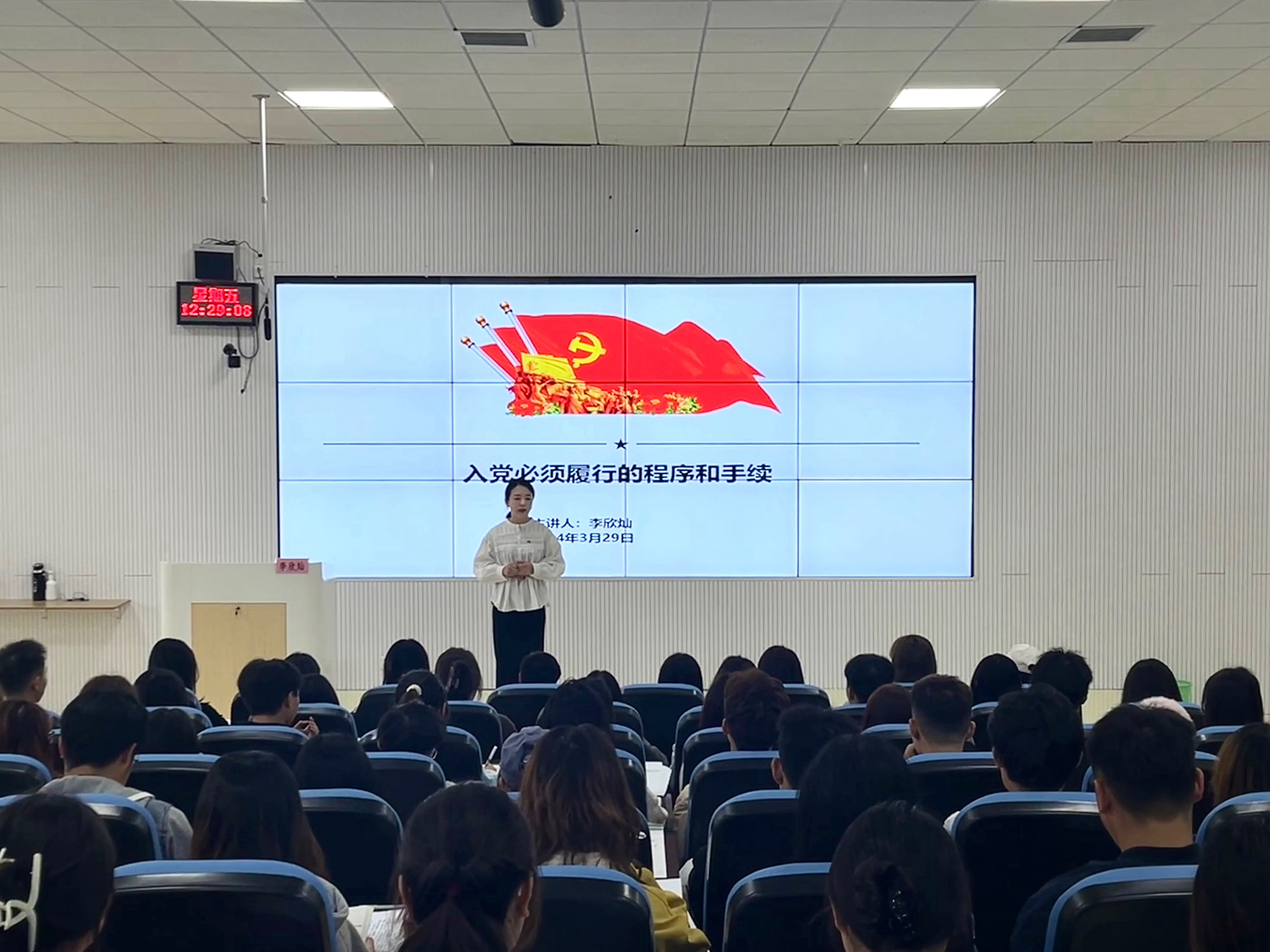 李欣灿对发展党员工作的5个阶段25个流程,申请入党、入党积极分子的确定和培养、发展对象的确定和考察、预备党员的接收、预备党员的教育考察和转正以及对发展党员工作过程中的总要求等内容进行详细讲解,希望大家能够积极地参加实践活动,以身作则的同时还要帮助和引导身边同学,发挥先锋模范作用,要鞭策自己全面发展,不断提高综合素质、应用能力和创新能力。