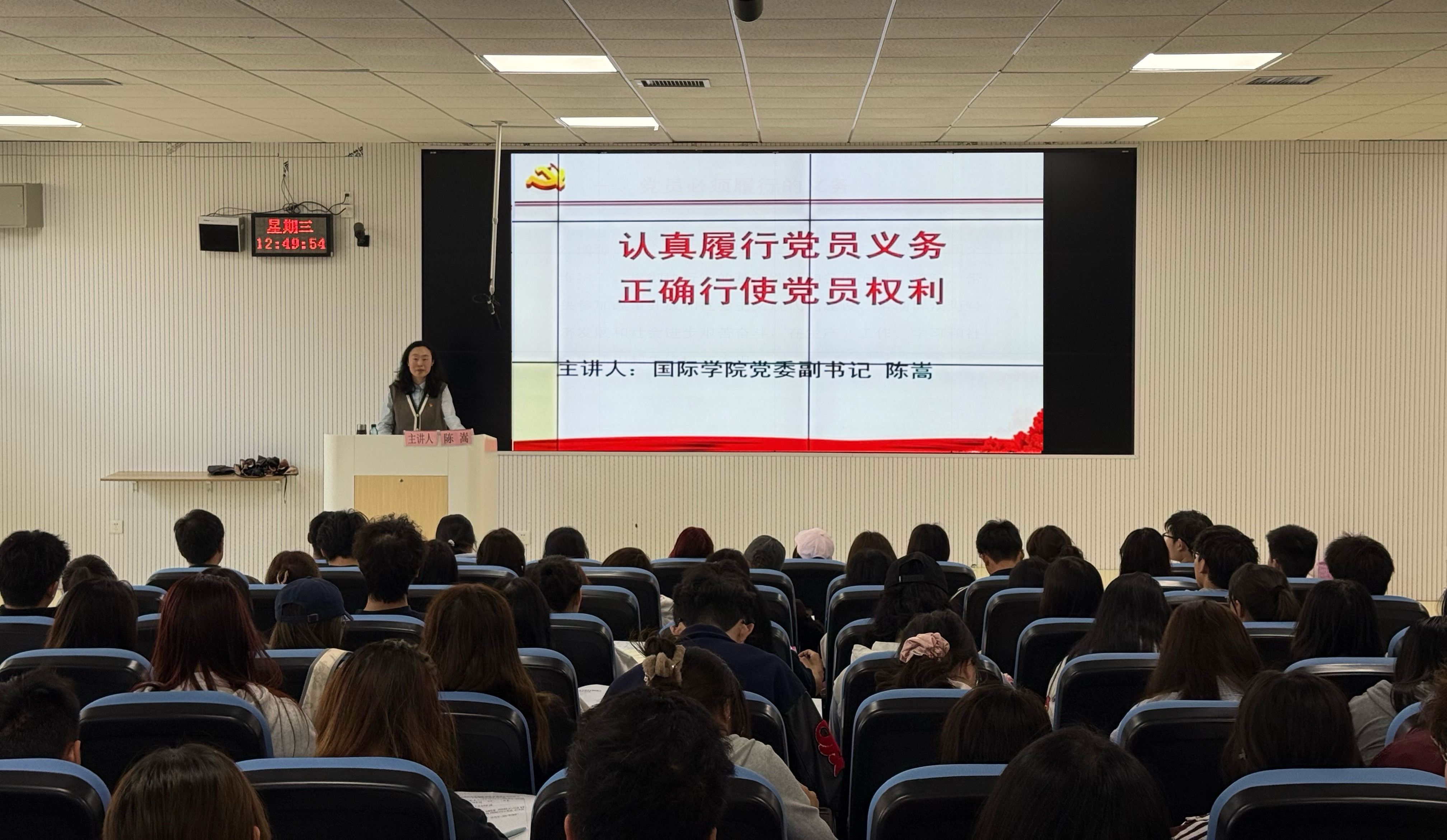 (betway西汉姆官网 颜岫影 报道|摄影 刘依月棋)3月26日,国际公司党委副书记陈嵩在乐学楼102教室为2025春季入党积极分子及支部党员作《认真履行党员义务,正确行使党员权利》专题党课。