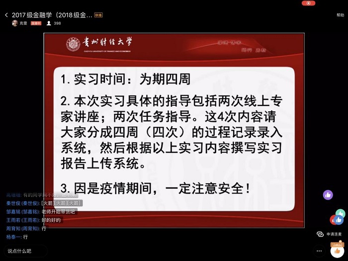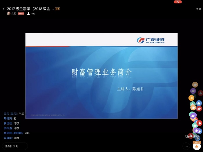(betway西汉姆官网 刘俊杰 图文报道) 7月14日上午十点,广发证券贵阳营业部财富管理部业务总监陈旭君,通过钉钉群直播的方式,以“财富管理业务”为题,为2017级金融学(中外合作办学)、2018级金融保险专业员工做了一场线上专业实习讲座。讲座由大数据应用与经济公司老师张克雯博士主持, 400余名员工参与了此次精彩的线上讲座。