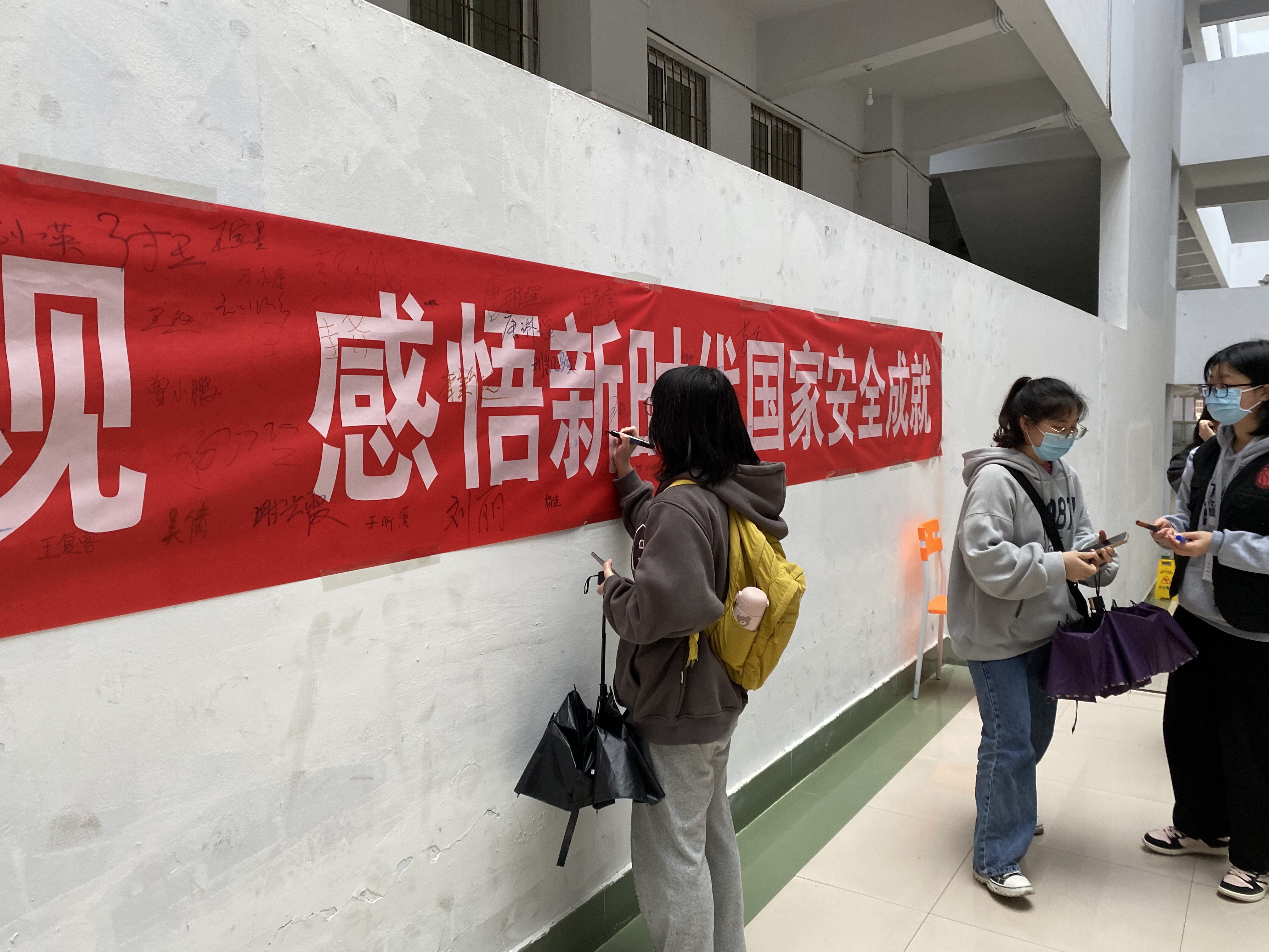 活动现场,工作人员给同学们普及国家安全知识,宣传《宪法》、《国家安全法》、《反恐怖主义法》等国家安全相关法律法规。介绍近年来破获的破坏国家安全的案例,组织同学们对国家安全相关话题进行交流讨论,畅谈感悟,加强了同学们对国家安全的理解,进一步提高防范的意识。同学们还在横幅上签名,表明自觉、主动维护国家安全的决心。