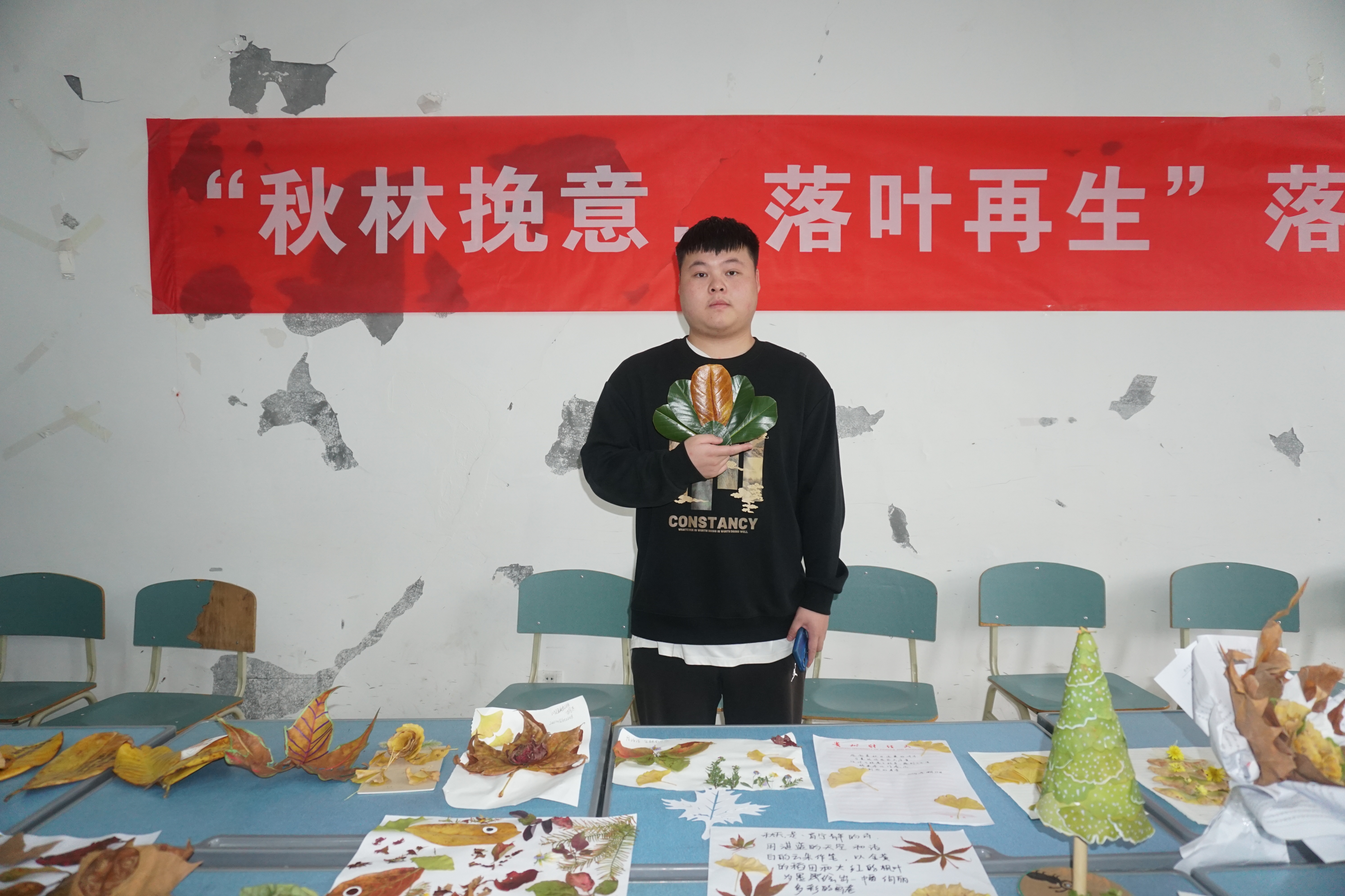 秋意渐浓,校园内的树木披上了金黄色的外衣,落叶纷飞,为校园增添了几分诗意与画意。此次活动正是抓住了这一自然美景,引导同学们用落叶进行创作,展现自己的艺术才华和创新能力。活动当天,同学们纷纷将自己精心制作的落叶创作作品带到现场。这些作品形式多样,内容丰富,既有以落叶为原材料搭建的“塔”和“花”,也有利用落叶剪贴而成的“流云”和“诗画”。每一件作品都蕴含着同学们对美的追求和对秋天的热爱,展示了他们丰富的想象力和创造力。还有部分同学在现场进行创作。他们灵巧的双手在落叶间跳跃,一片片落叶在他们的手中变成了栩栩如生的艺术品。这样的创作过程不仅让同学们感受到了美的力量,也激发了他们对美的向往和追求。