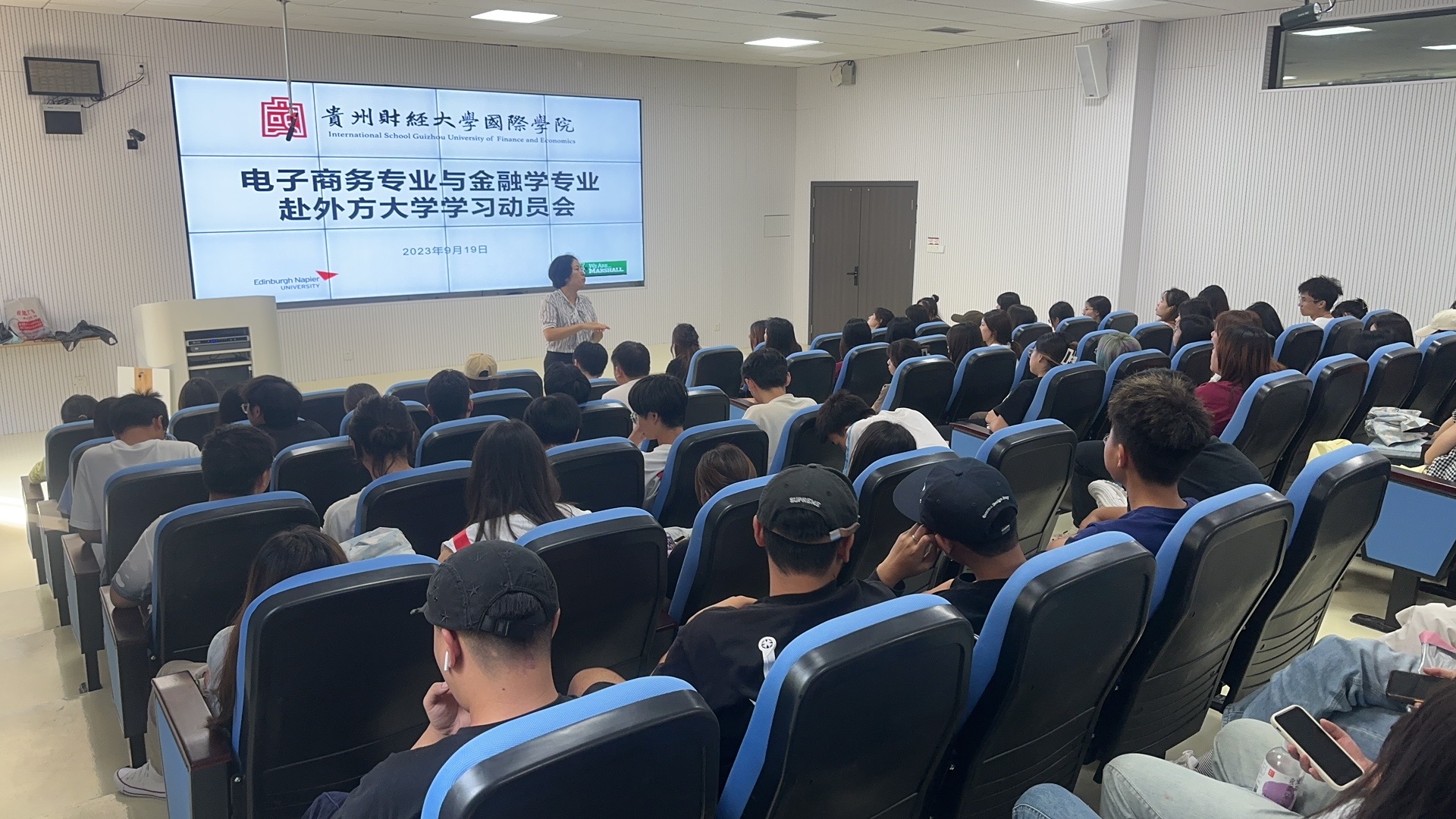 (betway西汉姆官网 卫荷 图文报道)9月19日下午,betway西汉姆官网在乐学楼阶梯1-1教室以线上、线下的方式同步举办了电子商务专业员工赴美国马歇尔大学学习动员会。betway西汉姆官网经理罗亚、副经理刘利音、美国马歇尔大学刘易斯商公司中国项目主任黄国栋出席动员会。来自该项目2021级、2022级电子商务专业的200余名员工参加,会议由betway西汉姆官网项目科老师卫荷主持。