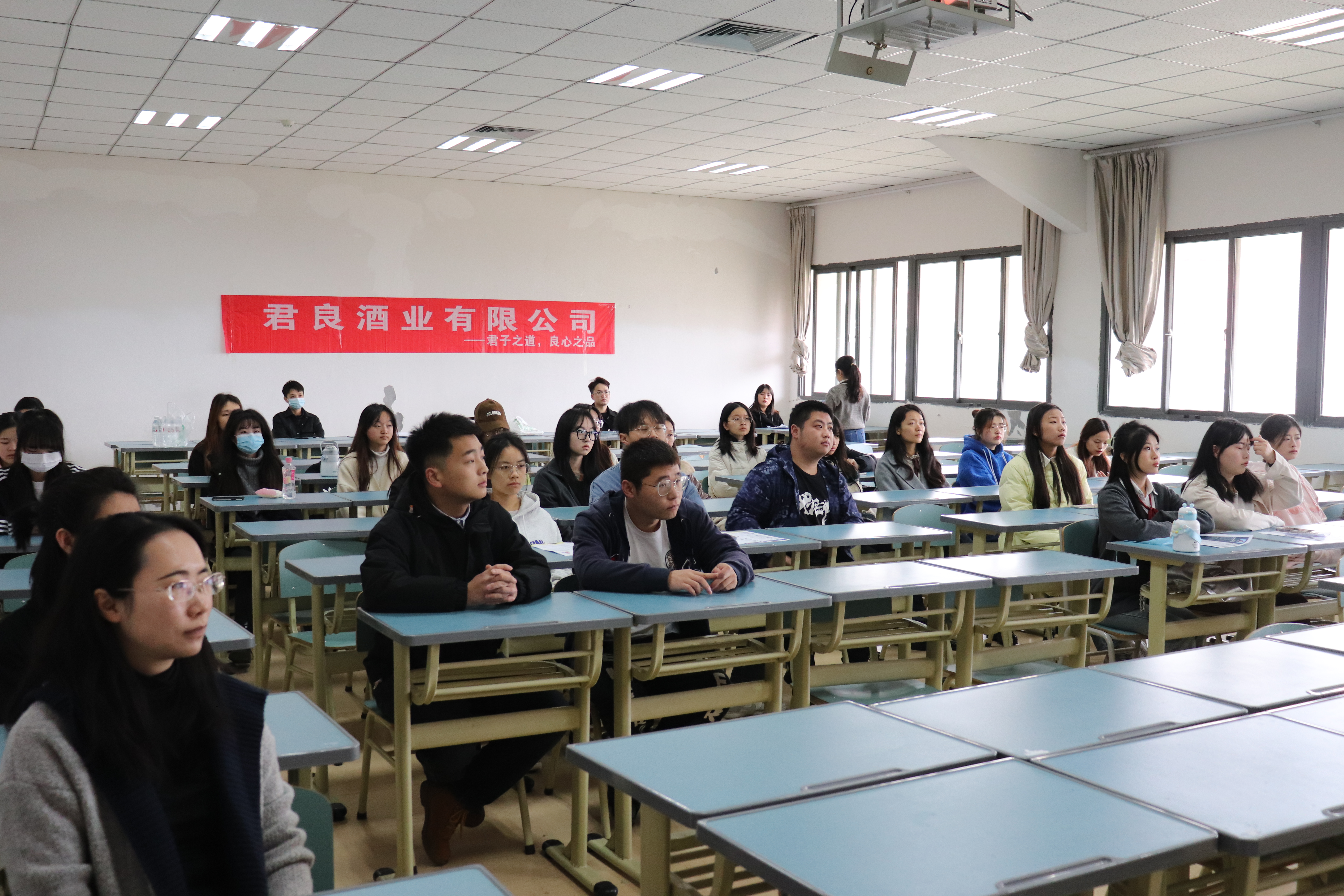 招聘会上,企业创始人韩振宇介绍了君良酒业的业务范畴,通过打造新消费场景,深度结合互联网,拥有完整的互联网+白酒的完整生态,成功打造多个白酒类垂直账号,以品鉴为核心,传播白酒品评文化、提升消费者白酒鉴赏能力。韩振宇给还未“配妥剑”就要“闯江湖”的毕业生分享工作和创业经验,阐明了职场与校园的差异,结合自己的亲身经历讲解“先就业再择业”的重要性,并与现场提问的同学进行互动交流。