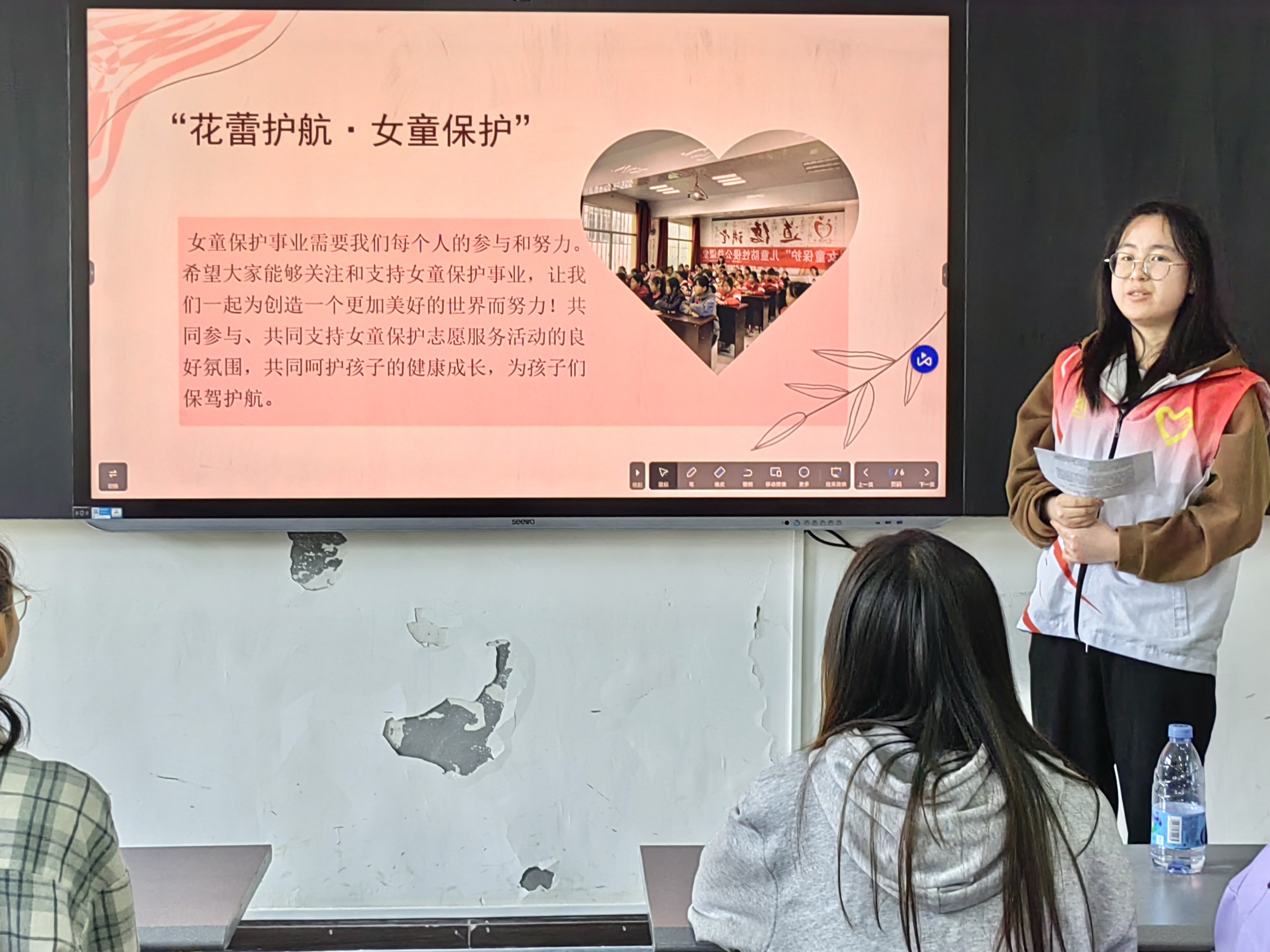宣讲会上,志愿者讲师们介绍了“花蕾护航·女童保护”活动的背景和意义。她们提到,儿童作为社会中最脆弱的群体之一,面临着诸多潜在的安全风险。而“花蕾护航·女童保护”活动正是为了关注儿童的身心健康,通过宣传和教育,提高她们的自护意识,防止遭受不法侵害。志愿者讲师结合自身的经历,详细讲述了在志愿者工作中遇到的典型案例和感人故事。她们分享了如何与孩子们建立信任关系,如何教会她们认识自己的身体、防范性侵害,以及如何应对突发情况等实用技巧。这些生动的故事和鲜活的案例,让在场的同学们深受触动,更加深刻地认识到女童保护工作的重要性。