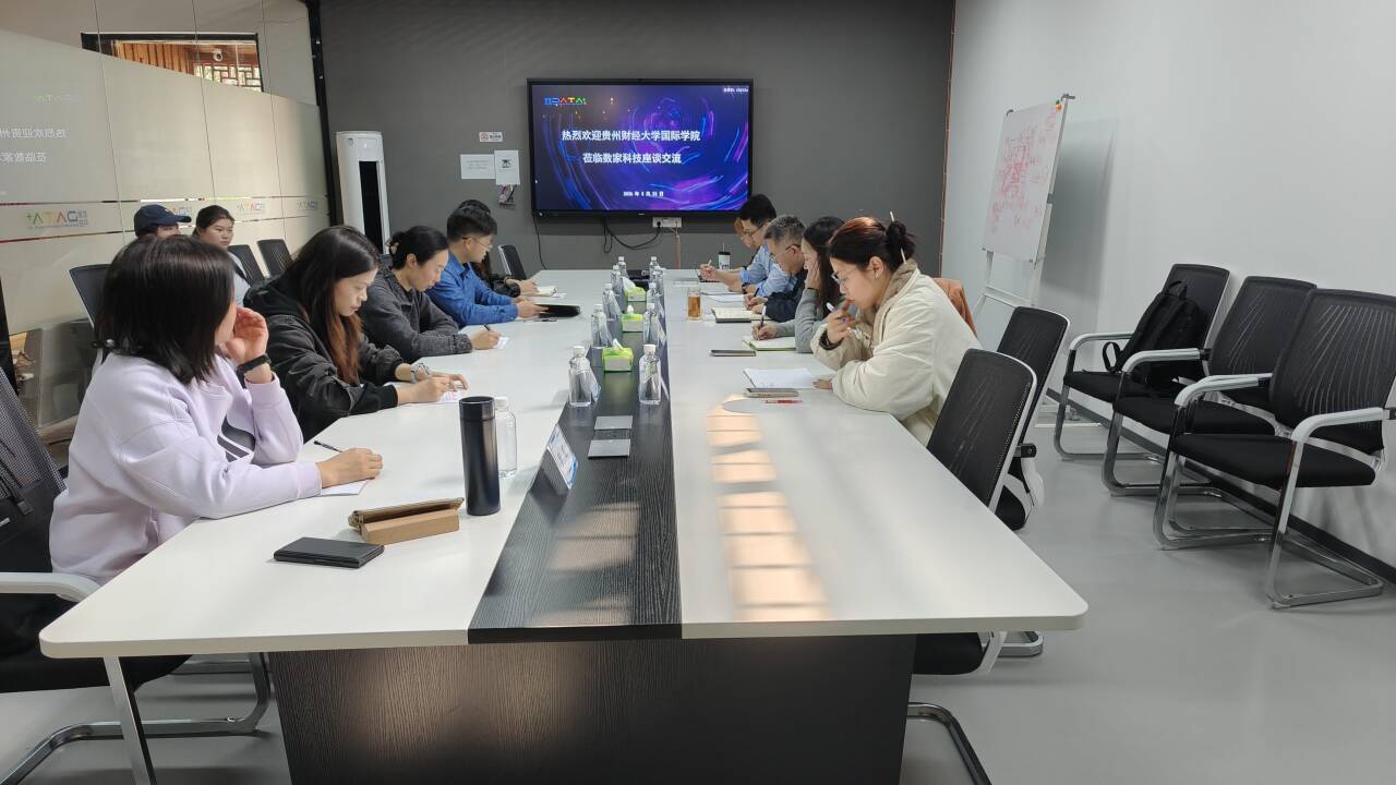 座谈会上,邹晓峰首先介绍了公司国际化办学特色,强调公司致力于培养具有国际视野的高素质应用型人才。陈嵩重点介绍了公司2026届1353名毕业生的就业情况,并提出希望与贵州数家科技有限公司建立长效合作机制。随后,贵州数家科技有限公司总经理邓周灰和李镭详细介绍了公司的发展情况和对人才的需求。会上双方达成暑期选派优秀员工赴企业开展实习,企业择优开展延长实习期试点;共建AIGC实训班,员工经10-20天培训后参与真实项目;推进AI+金融自动化项目,面向有编程基础的员工长期招募并引导员工就业;引入飞书“效率先锋”认证培训,开放每周五AI实战分享会等多项合作共识。