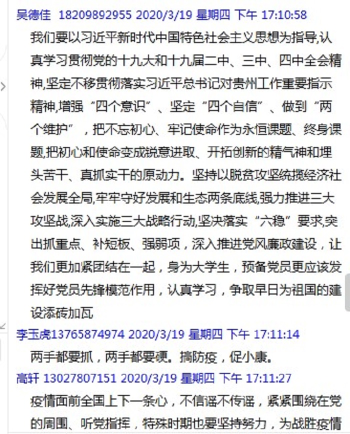 曾海燕、潘田春、李玉虎、孙孟等同志领学《习近平主持召开中共中央政治局常务委员会会议》精神、《2020年贵州省政府工作报告(全文)》《网络信息内容生态治理规定》《中共betway西汉姆官网委员会关于印发<betway西汉姆官网关于新冠肺炎疫情防控延迟开学期间加强师生思想政治教育的实施方案>的通知》《中共betway西汉姆官网委员会组织部关于认真做好在新冠肺炎疫情防控第一线发展党员工作的通知》等文件。领学完毕后,支部党员们积极讨论发言、分享学习心得。大家表示,作为员工党员,一定做好模范带头作用,积极响应国家号召以自身行动感染身边的人。