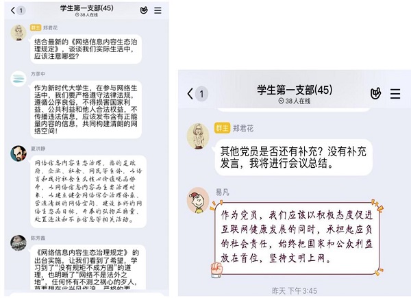 接着郑君花要求结合最新的《网络信息内容生态治理规定》,谈谈我们实际生活中,应该注意哪些?由夏洪静等27名同学根据“规定”提出了自己认为需要注意的地方,易凡同志进行了补充。