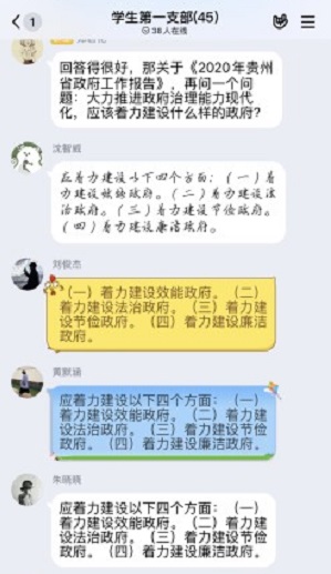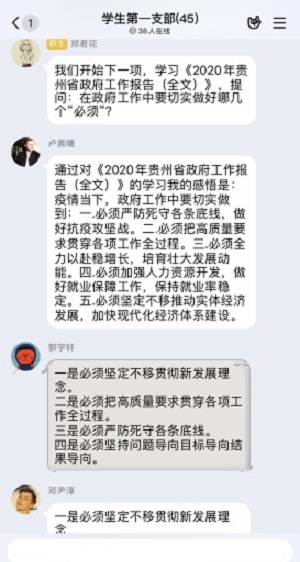 会议进程第三项:对《2020年贵州省政府工作报告(全文)》进行学习,郑君花提出问题:在政府工作中要切实做好哪几个“必须”?郭宇轩等32名党员给出了标准答案。