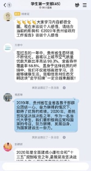 最后,支部党员对《2020年贵州省政府工作报告(全文)》进行讨论,并提出感悟。由方彦中同学带头,全体党员参与了讨论,并且提出了自己的感想,同志们学习交流的劲头势不可挡,之后郑君花对发言作出了总结。