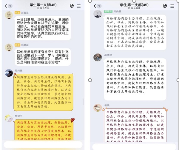会议进程第四项:大会进行到下一项学习《网络信息内容生态治理规定》,郑君花提出问题:什么是网络信息内容生态治理?邓炜亮等27名党员结合所学内容给出了答案。