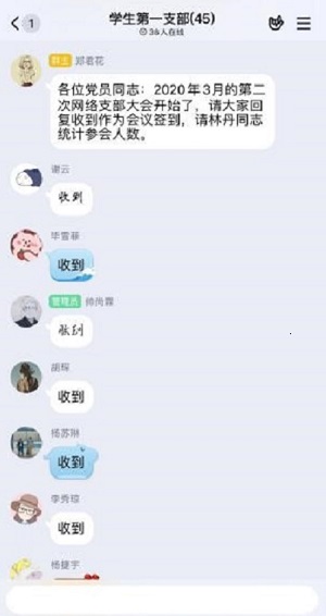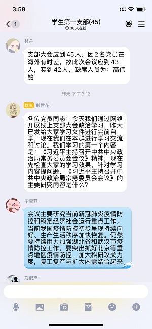 (betway西汉姆官网 郑君花 图文报道)疫情当前,为抓好党员日常管理教育,严格落实“三会一课”制度,保障疫情期间学习不断,同时为加强支部教师及员工党员在特殊事情对党理论知识的学习和对疫情局势的把控,betway西汉姆官网员工第一党支部于3月10日召开第二次网络支部大会,会议由支部书记郑君花主持,主要学习《习近平主持召开中共中央政治局常务委员会会议》精神、《2020年贵州省政府工作报告(全文)》、《网络信息内容生态治理规定》。本次会议是在会前个人自学的基础上进行网络上的集中交流讨论。会议过程中通过提问形式检查大家的学习效果、交流发言的形式进行讨论,最后支部书记进行总结。 会议进程第一项:郑君花对本次网络大会参会人数进行统计,并主持此次会议。