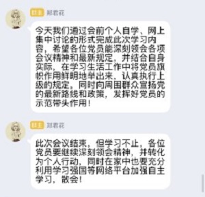 会议进程第五项:在会议的最后,郑君花对大会进行了补充说明及总结,并要求我们充分利用学习强国平台,不能停下脚步,坚持学习,发挥好党员的带头模范作用。