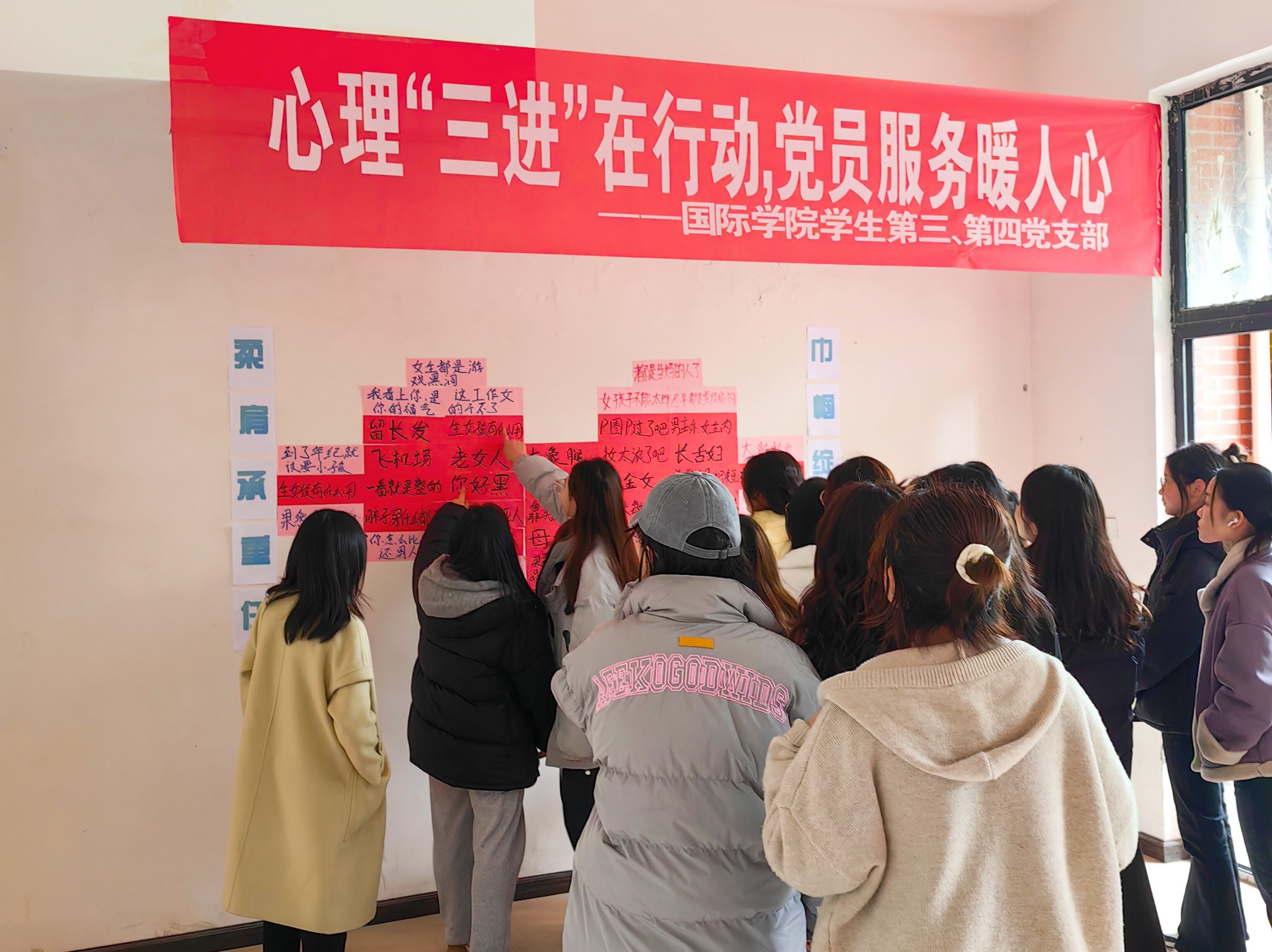 在活动中,betway西汉姆官网员工第三党支部书记李雨霏及第四党支部书记耿贵情带领支部党员深入员工宿舍楼,和员工开心互动,把表示偏见、束缚、负能量的标签贴在墙上,鼓励大家勇敢把标签从墙上撕下来,标签的另一面则是鼓励、正能量的话语。