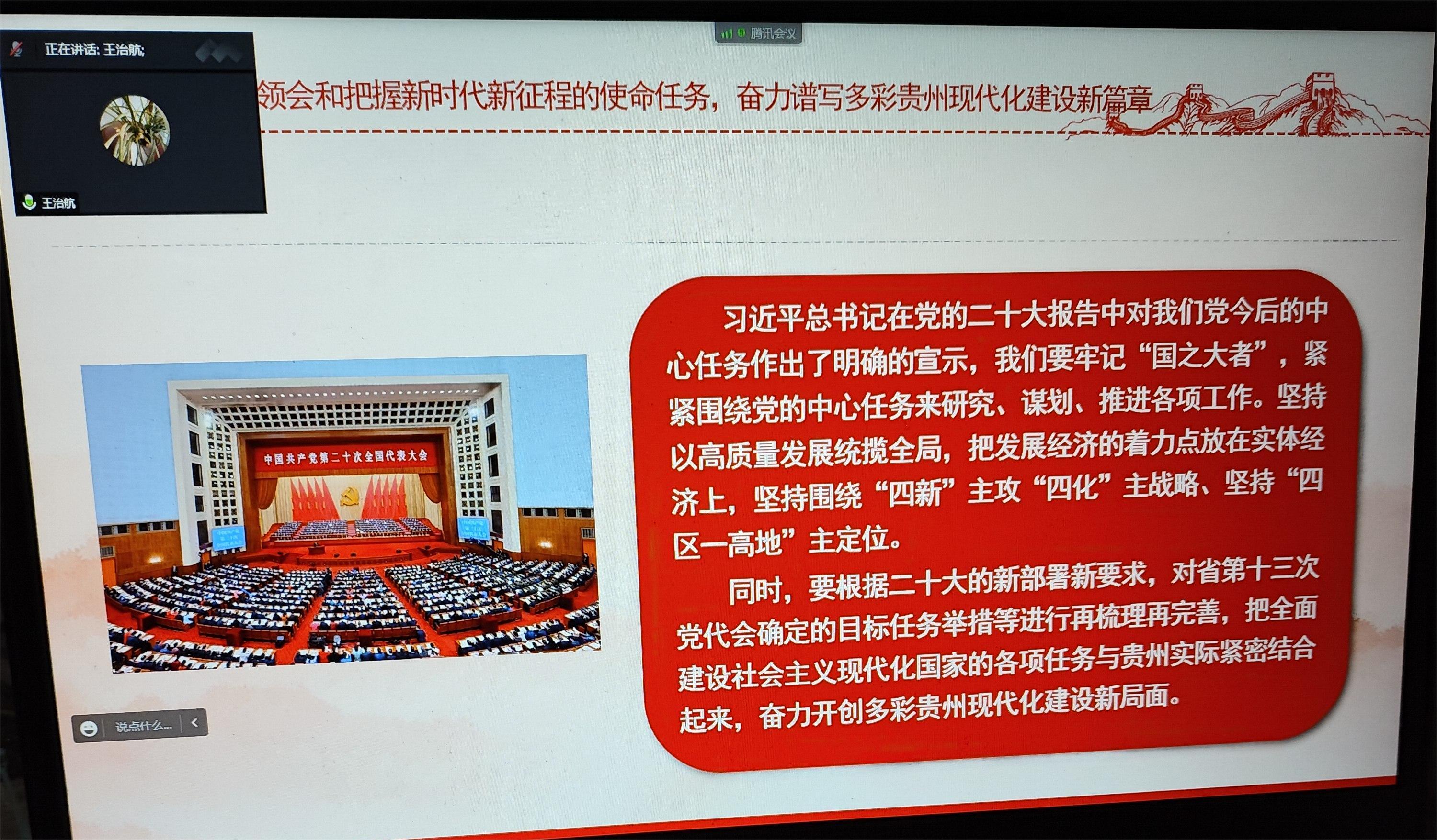 (betway西汉姆官网 潘吉 图文报道)2023年1月13日上午,贵州省教育系统“百千万”人宣讲团成员、国际公司党委书记王治航线上为其所在的betway西汉姆官网教工党支部宣讲党的二十大精神。宣讲主题为“深入学习贯彻党的二十大精神 高举中国特色社会主义伟大旗帜,为全面建设社会主义现代化国家而团结奋斗”,betway西汉姆官网教工党支部全体成员参加。