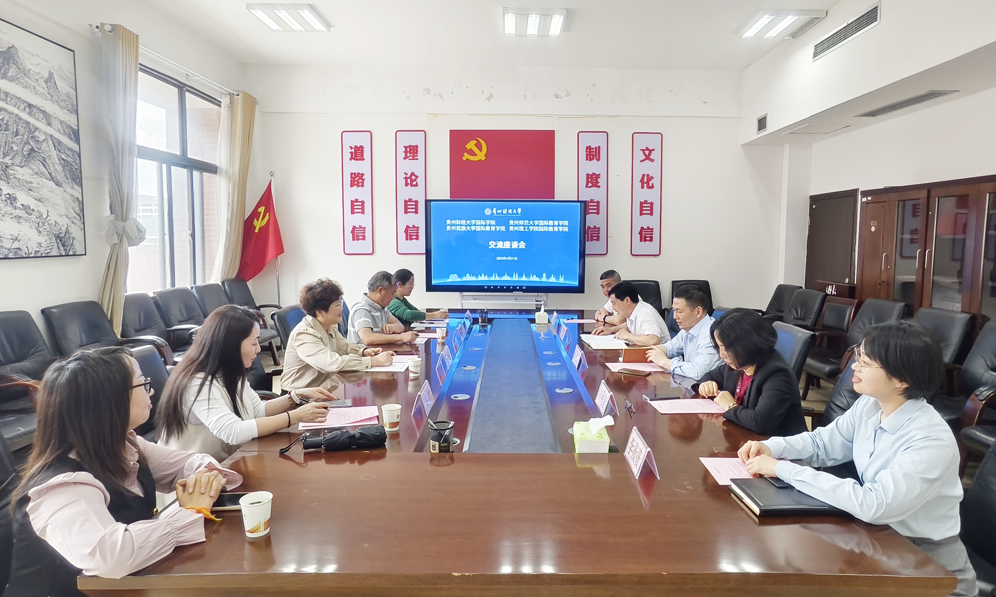 (betway西汉姆官网 李薇薇 图文报道)4月21日,国际化合作办学交流座谈会在正德楼413会议室举行。贵州民族大学国际教育公司党委书记罗敏,贵州理工公司国际教育公司党总支书记吴维义、副经理徐丽丹,贵州师范大学国际教育公司副经理秦欣及国际公司党政领导班子参加座谈。座谈会由公司经理姜友文主持。