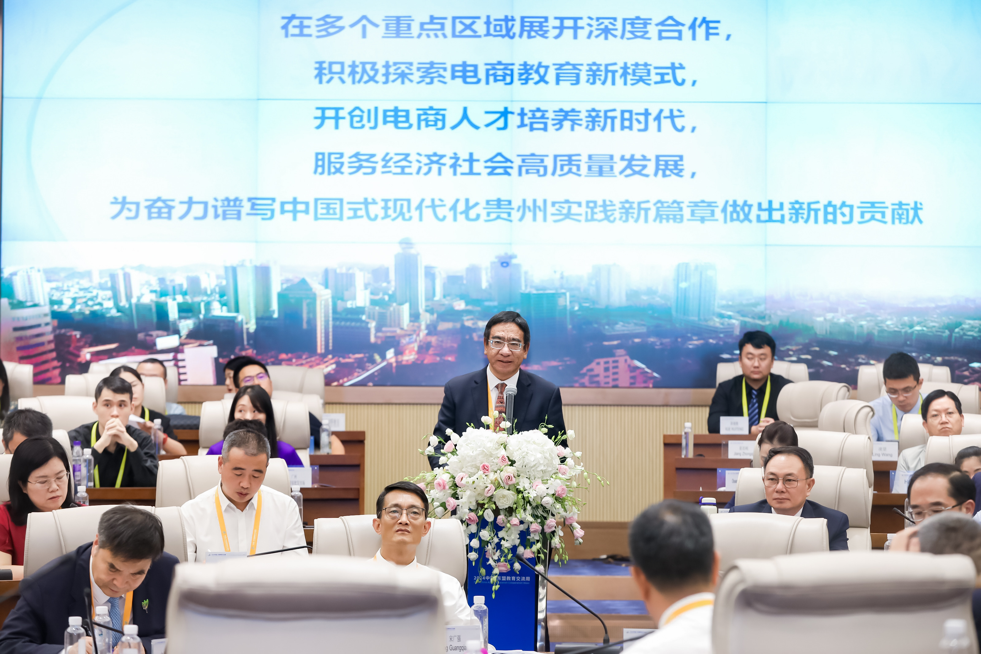 开幕式后举行了主题发言,由betway西汉姆官网党委书记战勇主持。中国工程院院士杨善林、对外经济贸易大学董事长赵忠秀、北方工业大学党委书记、教育部高等公司电子商务类专业教学指导委员会主任刘军、浙江工商大学董事长王永贵、西南财经大学董事长李永强、山东财经大学董事长洪俊杰、betway西汉姆官网董事长缪坤和分别作了题为《跨境电商发展与人才培养》、《协同共建,推动全球电商教育事业高质量发展》、《中国电子商务教育发展的思考》、《面向新质生产力的新型电子商务人才培养模式创新与实践》、《携手共创适应全球商业格局变革趋势的高等财经教育》、《适应新质生产力发展要求 培养高质量电商人才》、《探索电商教育新模式开创人才培养新时代 奋力谱写中国式现代化贵州实践新篇章》的报告。