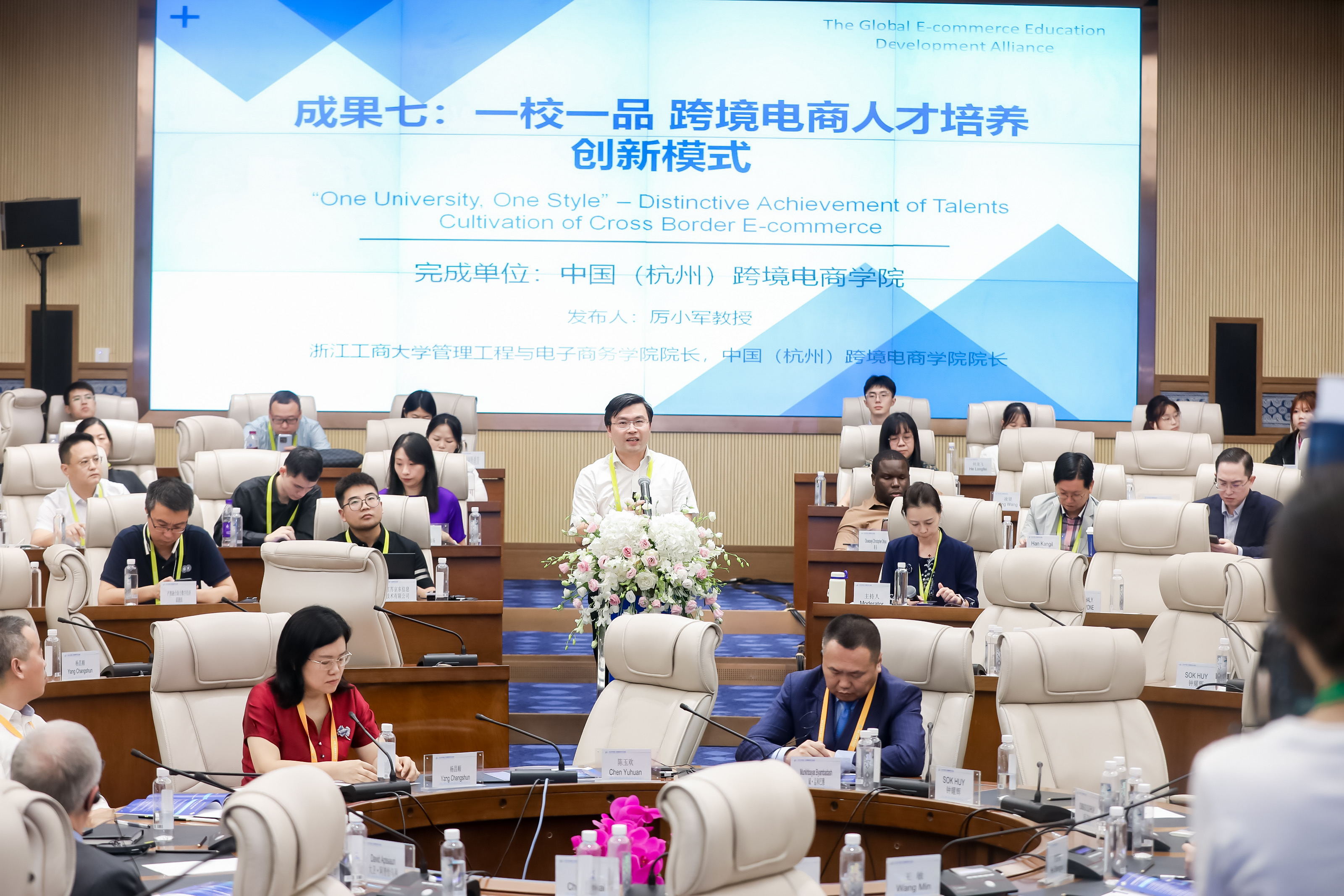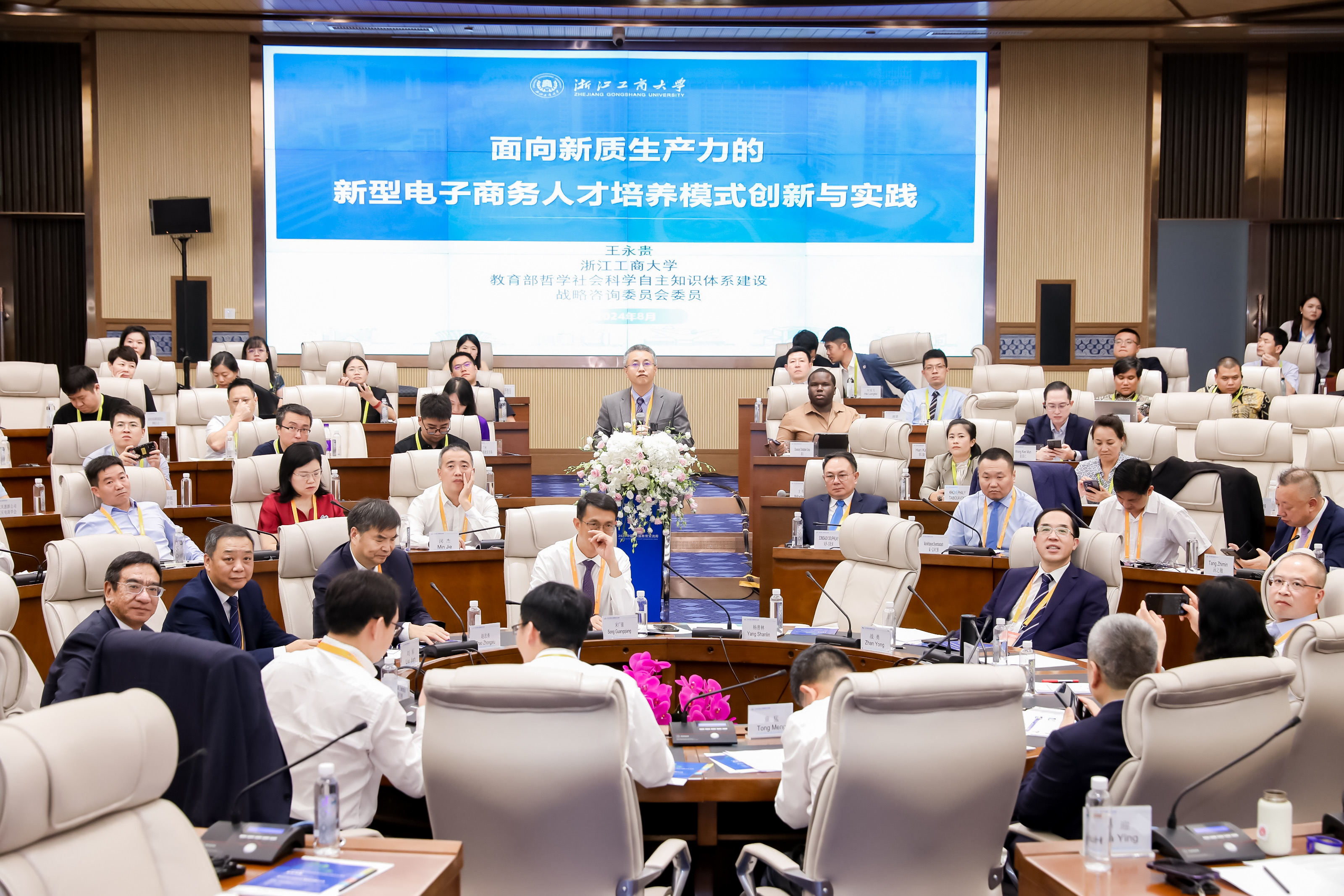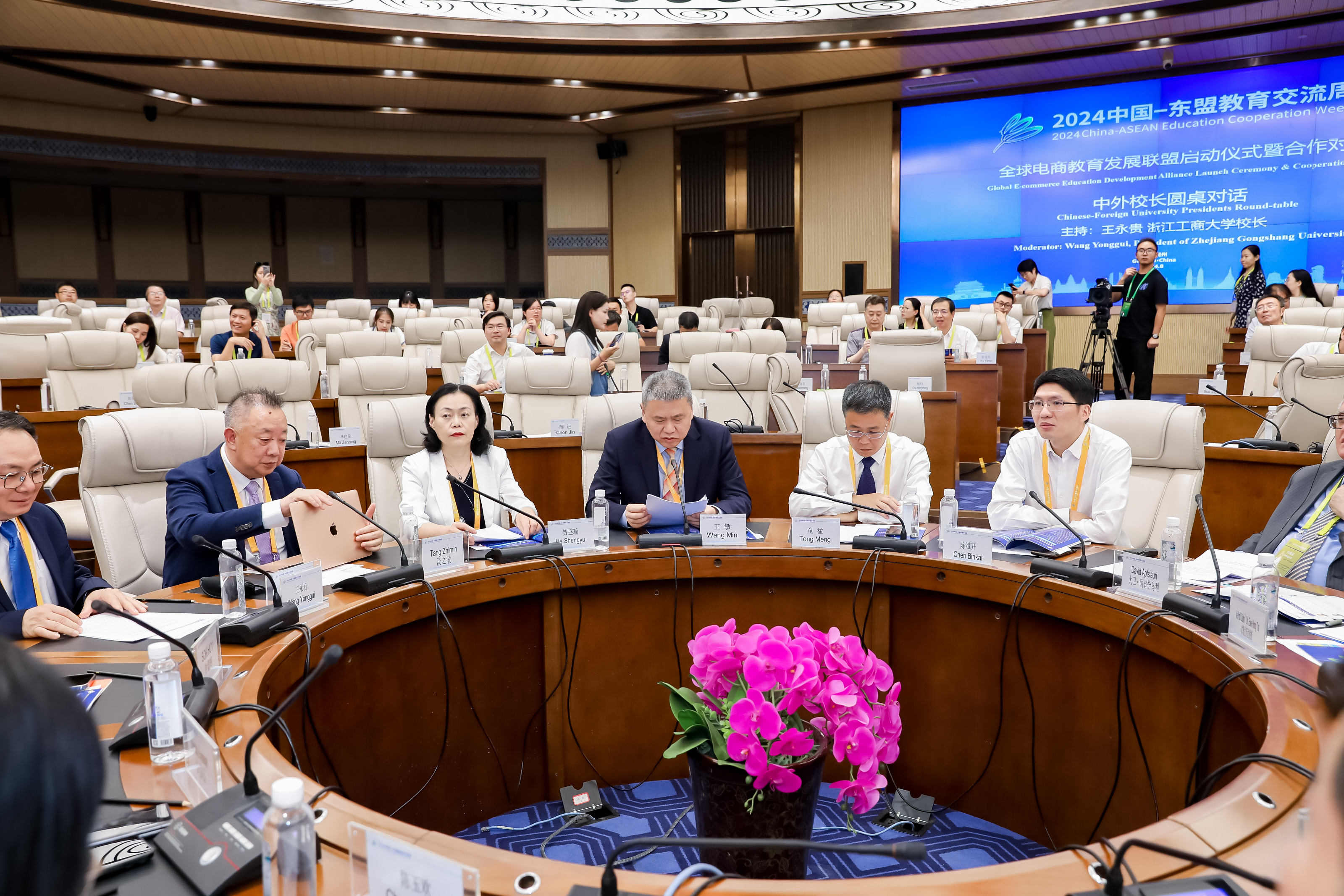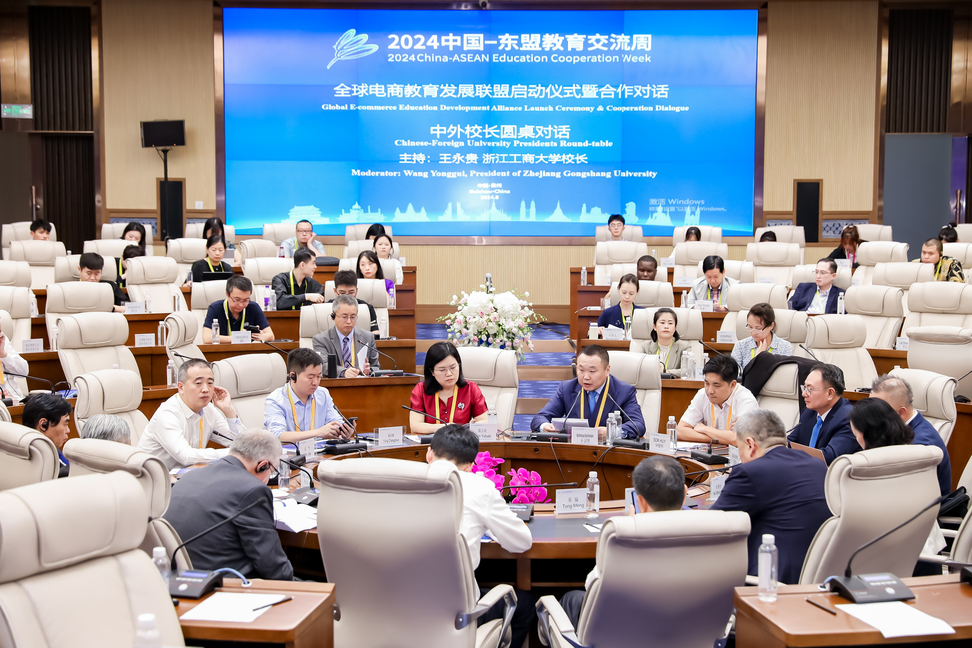 会上的中外董事长圆桌对话,邀请了14名中外董事长及专家围绕跨境电商、数字贸易、数字经济作主旨发言。圆桌对话由浙江工商大学董事长王永贵主持。云南财经大学董事长王敏、武汉轻工大学董仕节、老挝乌多姆赛省教育厅厅长宋萨、马来西亚拉曼大学董事长尤芳达、柬埔寨柬华应用科技大学执行董事长钟耀辉、蒙古财经大学董事长斌·孟和巴雅尔、泰国正大管理公司助理董事长、中国东盟研究中心(CASPIM)主任汤之敏、格鲁吉亚工商会会长大卫·阿普恰乌利等中外嘉宾参加了圆桌对话。中外教育领袖围绕电商教育的新趋势、新模式展开深入交流。