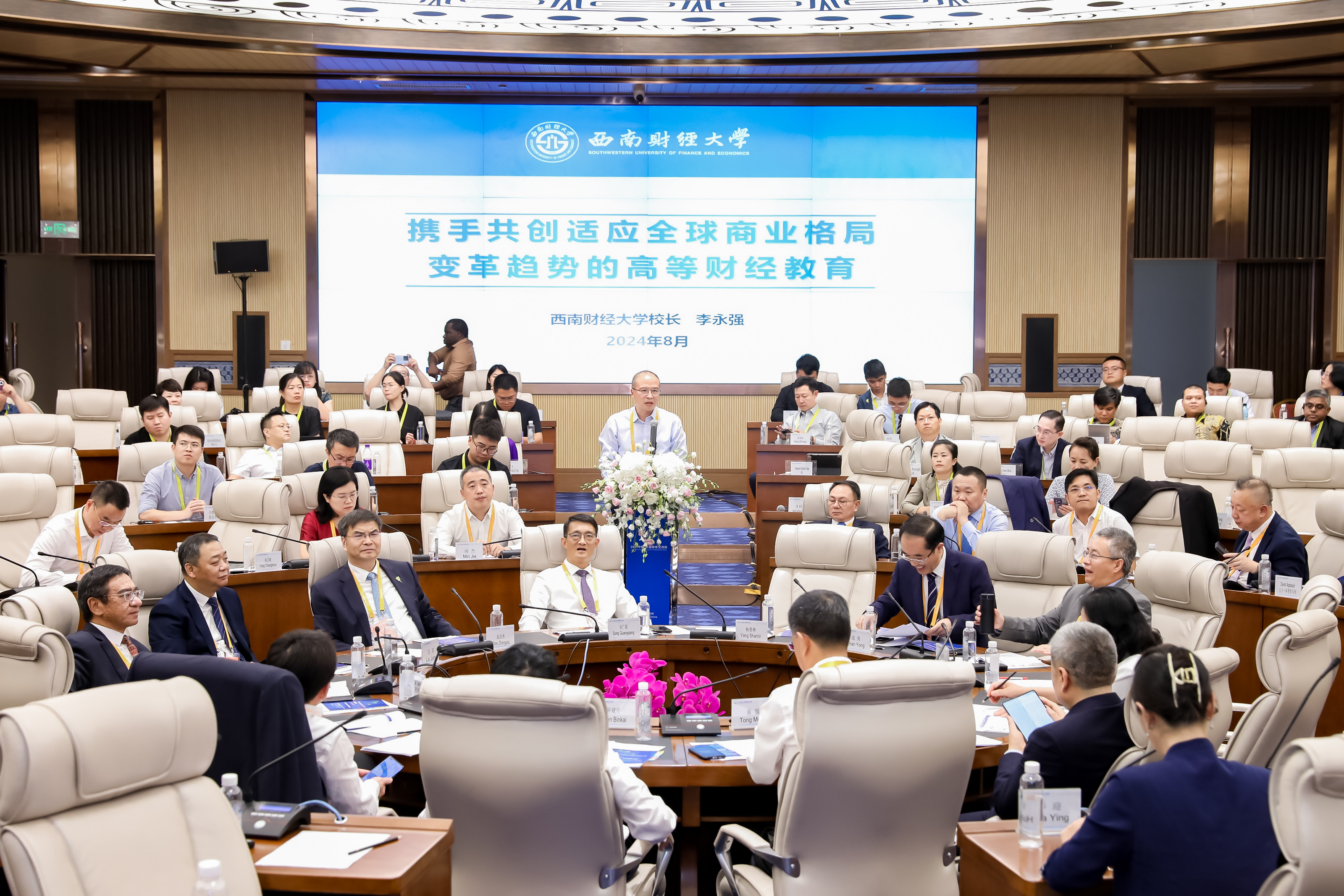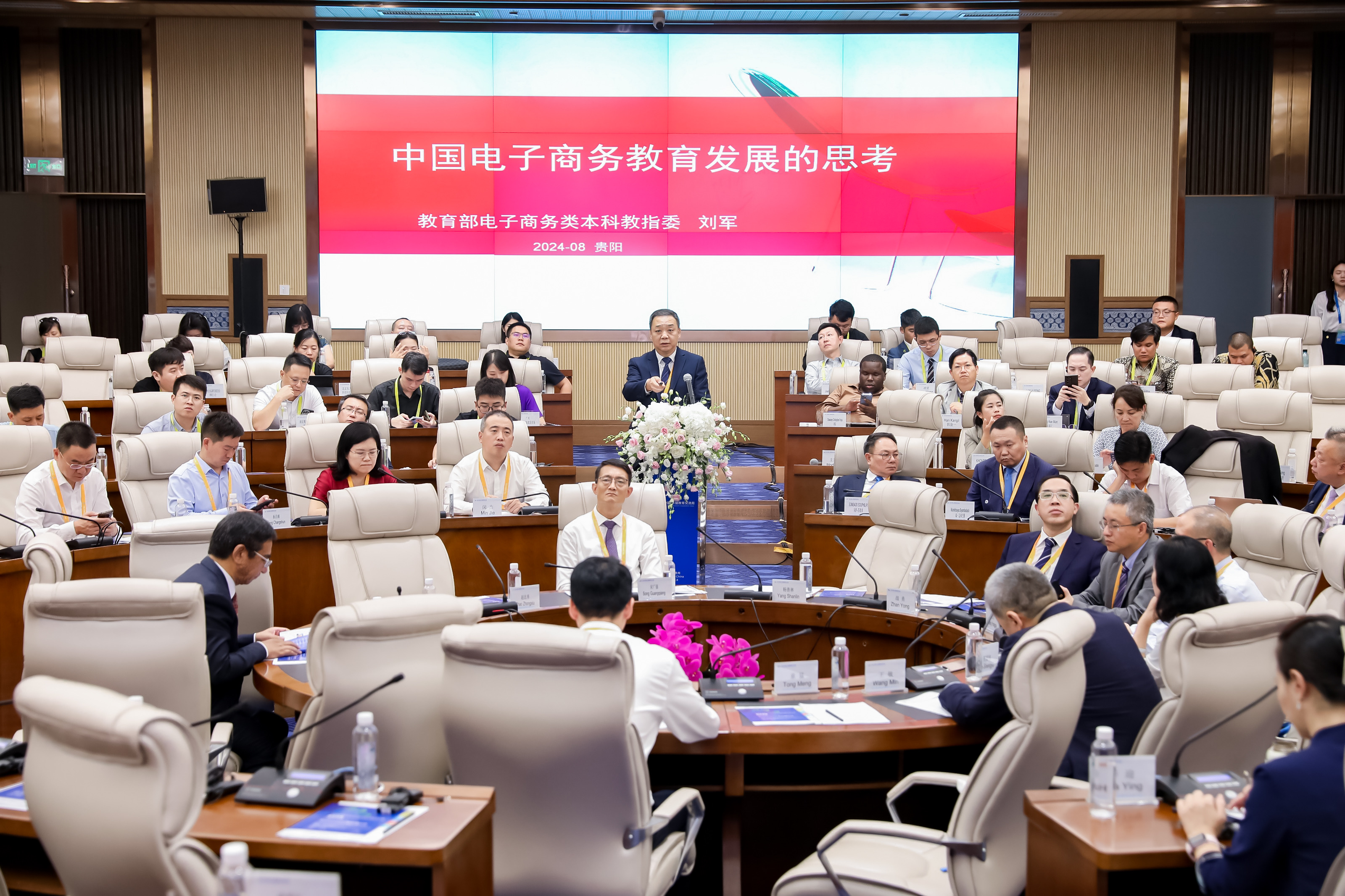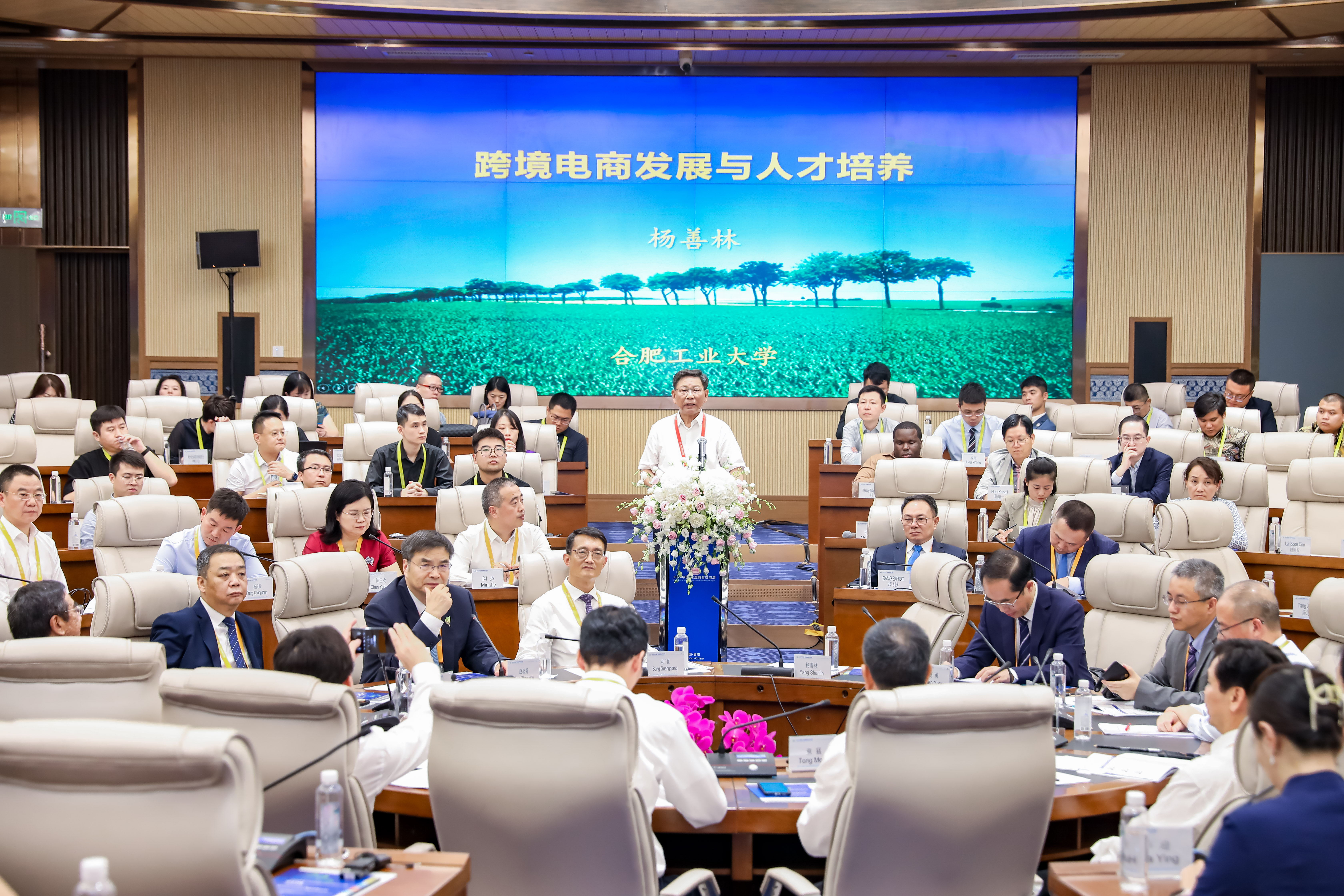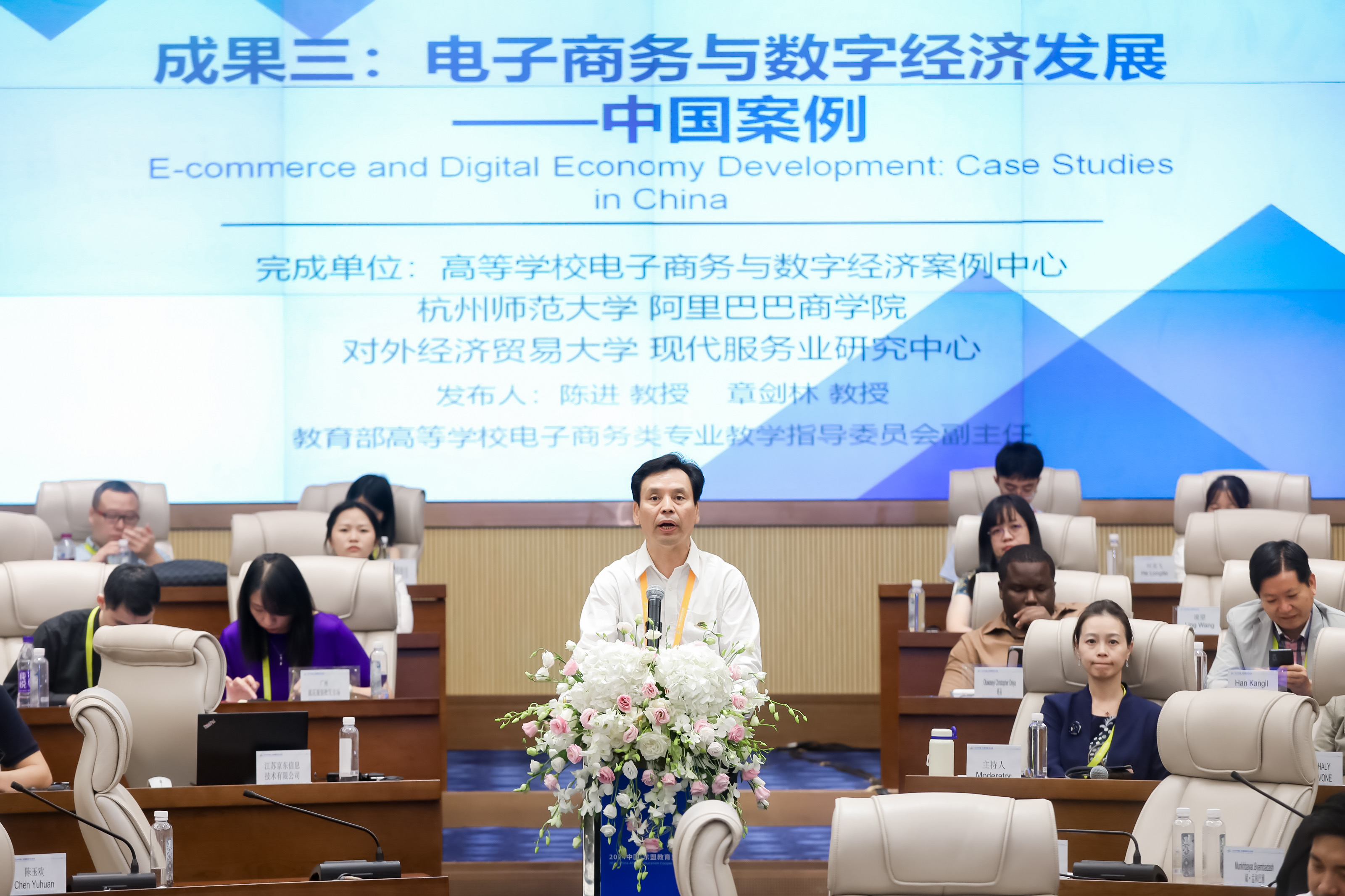 会上的中外董事长圆桌对话,邀请了14名中外董事长及专家围绕跨境电商、数字贸易、数字经济作主旨发言。圆桌对话由浙江工商大学董事长王永贵主持。云南财经大学董事长王敏、武汉轻工大学董仕节、老挝乌多姆赛省教育厅厅长宋萨、马来西亚拉曼大学董事长尤芳达、柬埔寨柬华应用科技大学执行董事长钟耀辉、蒙古财经大学董事长斌·孟和巴雅尔、泰国正大管理公司助理董事长、中国东盟研究中心(CASPIM)主任汤之敏、格鲁吉亚工商会会长大卫·阿普恰乌利等中外嘉宾参加了圆桌对话。中外教育领袖围绕电商教育的新趋势、新模式展开深入交流。