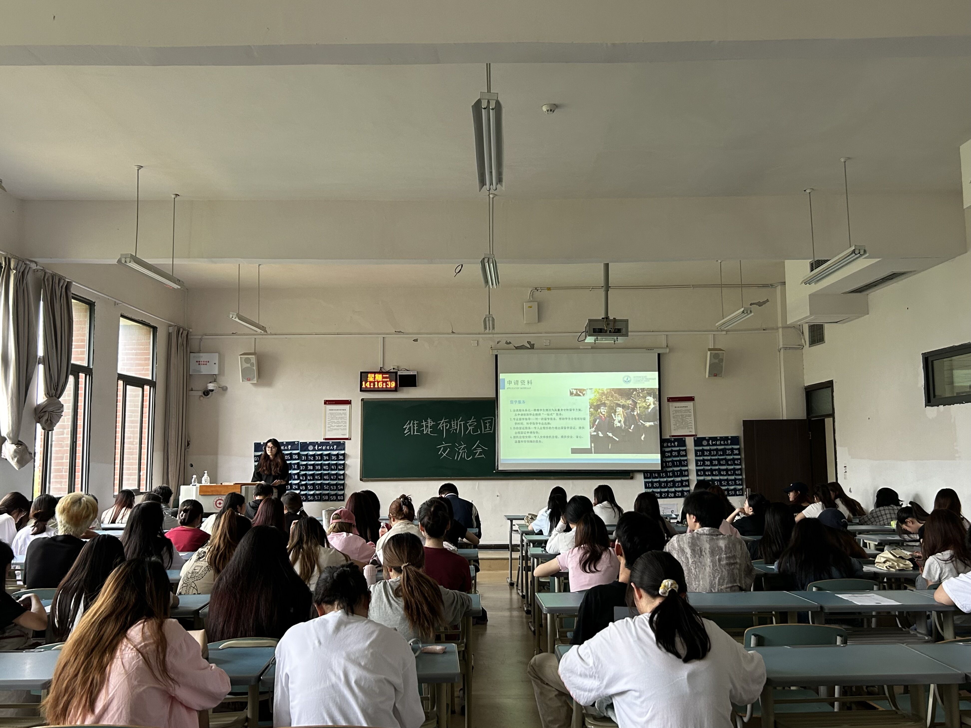 此次活动邀请了就读于白俄罗斯维捷布斯克国立大学的夏楚悦为同学们分享。夏楚悦首先为同学们介绍白俄罗斯的基本情况和当地文化,然后针对维捷布斯克国立大学的优势、公司简介、公司环境等相关信息进行了分享。随后,夏楚悦还为同学们耐心解答了在交流过程中关心的费用、学习年限、招生专业等相关问题。